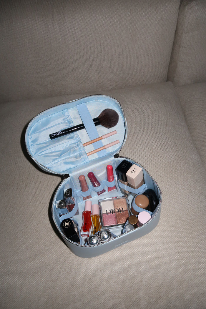 An elegant and timeless oval makeup bag in light ocean blue, crafted from premium vegan leather. Spacious enough for your beauty essentials, yet compact for everyday use.