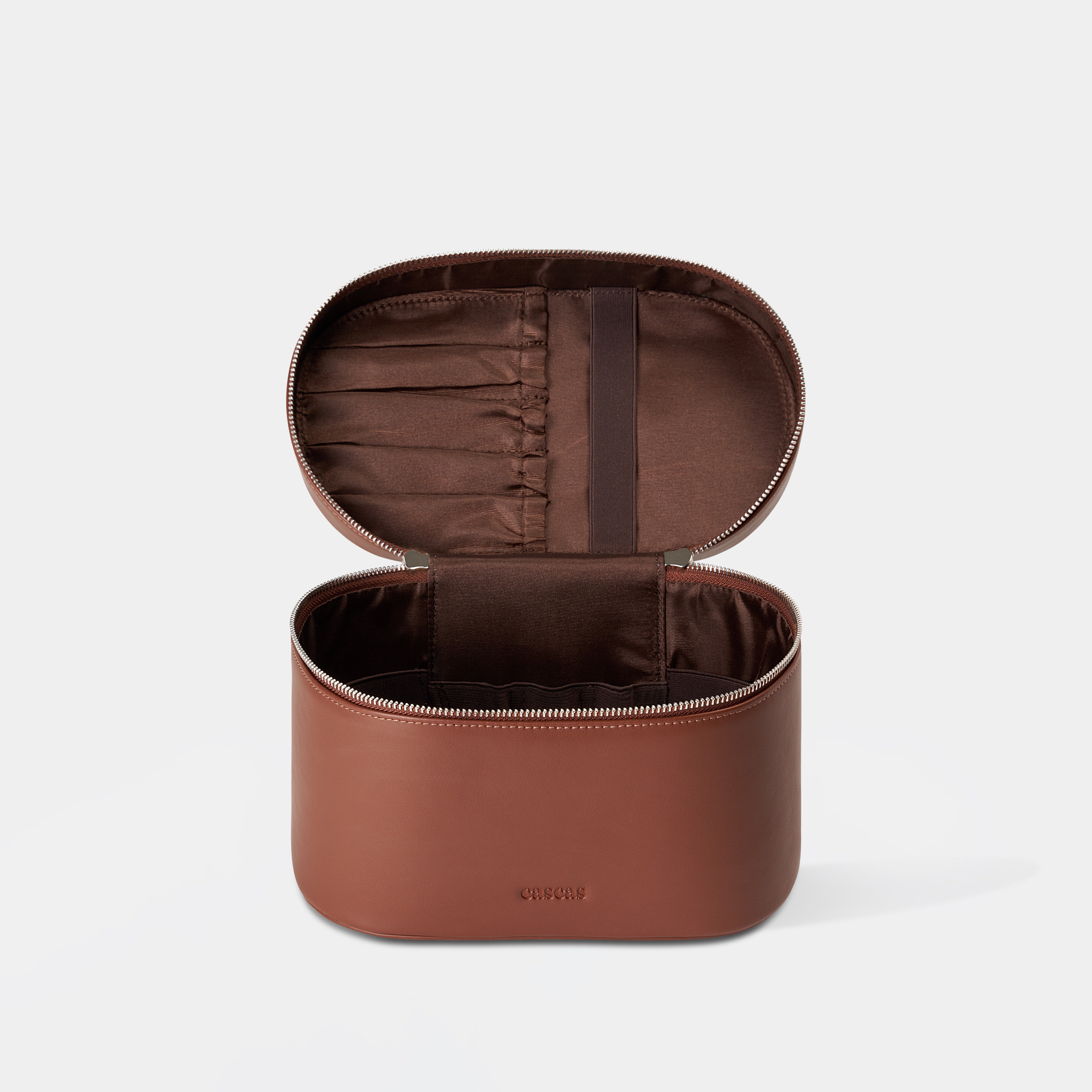 The Vanity Case is water-repellent and resistant to everyday spills. It can be easily cleaned with a soft, damp cloth to maintain its elegant look.