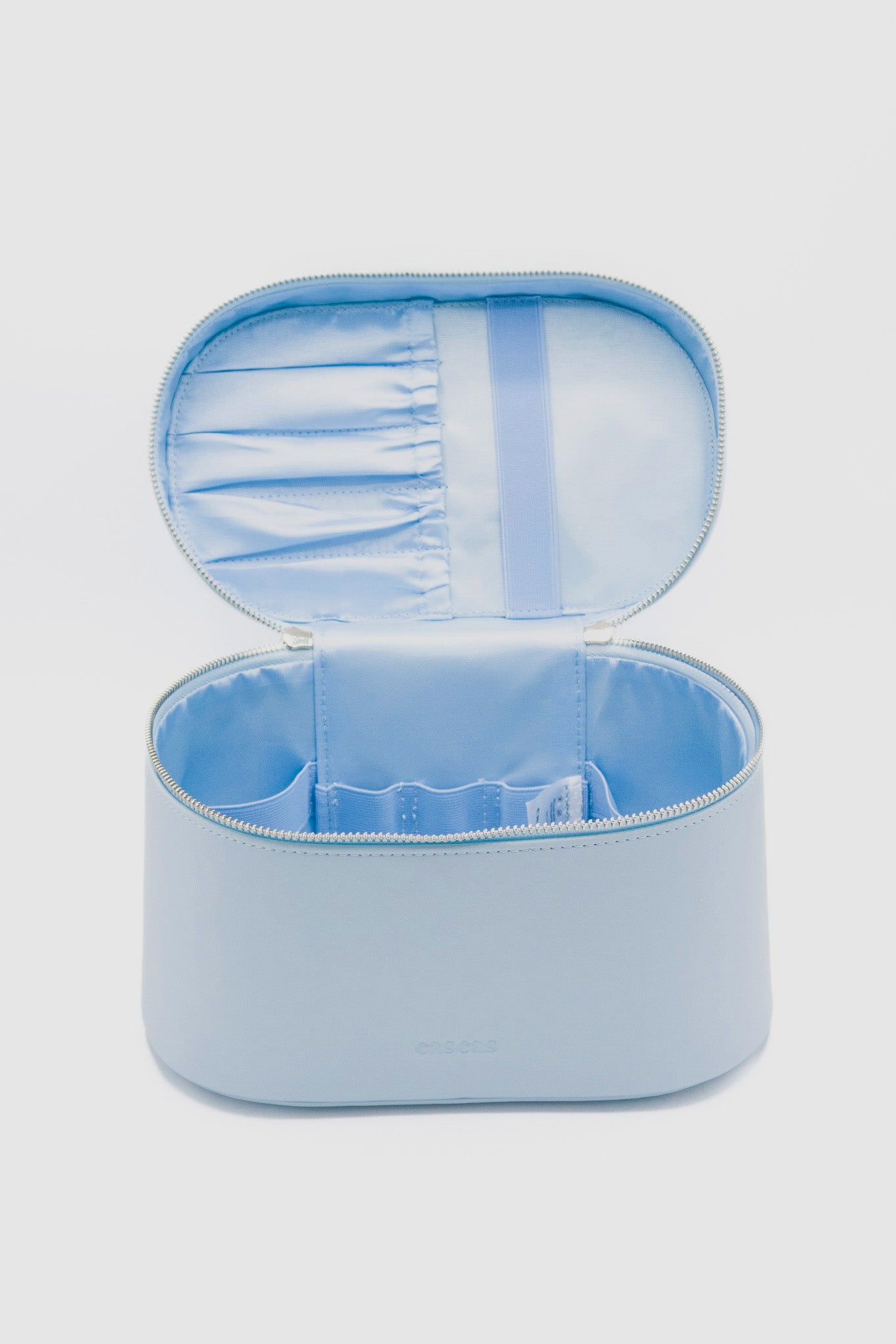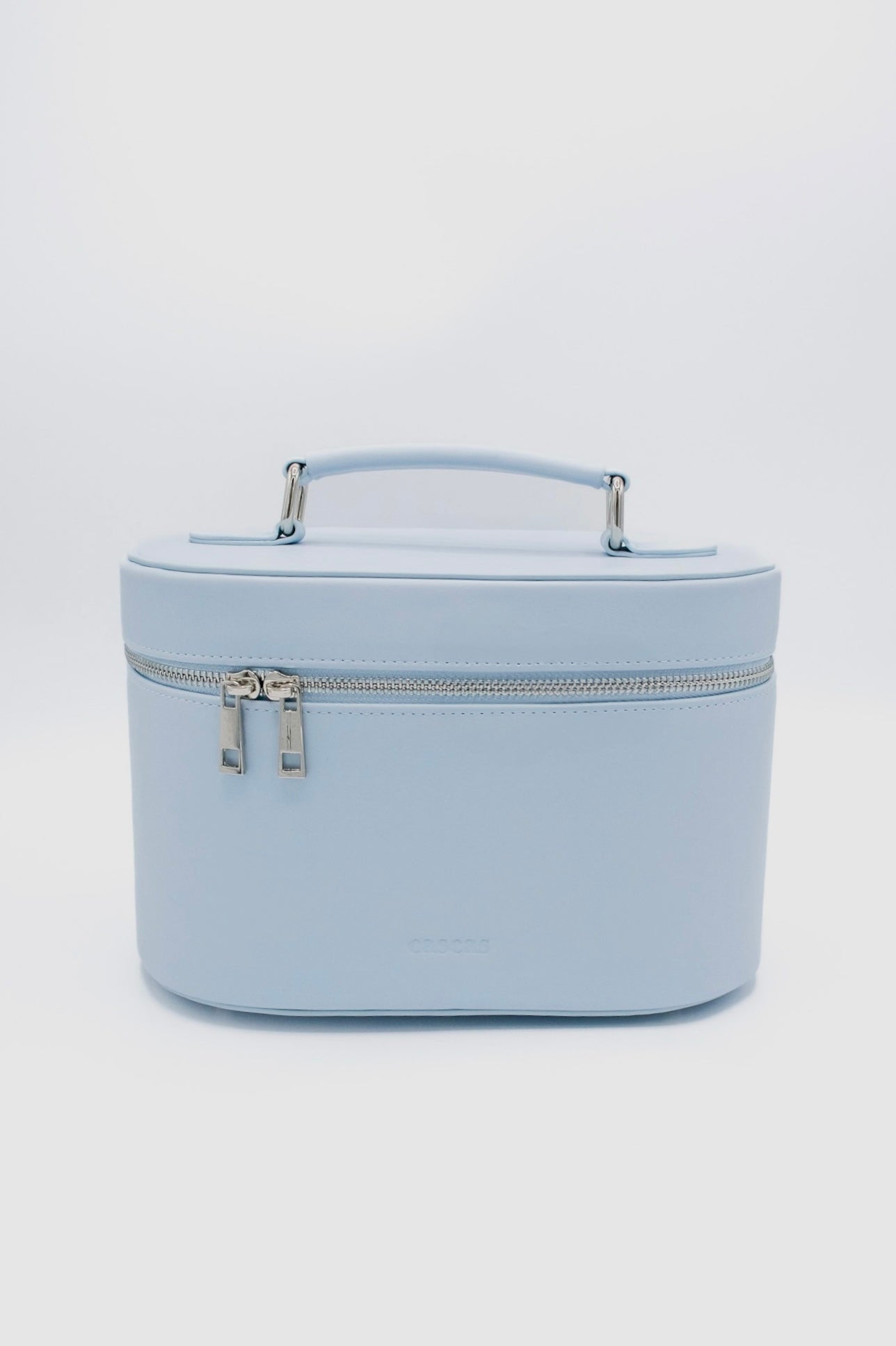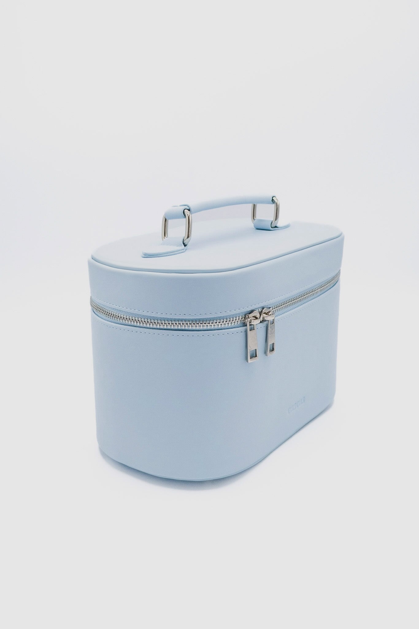 An elegant and timeless oval makeup bag in light ocean blue, crafted from premium vegan leather. Spacious enough for your beauty essentials, yet compact for everyday use.