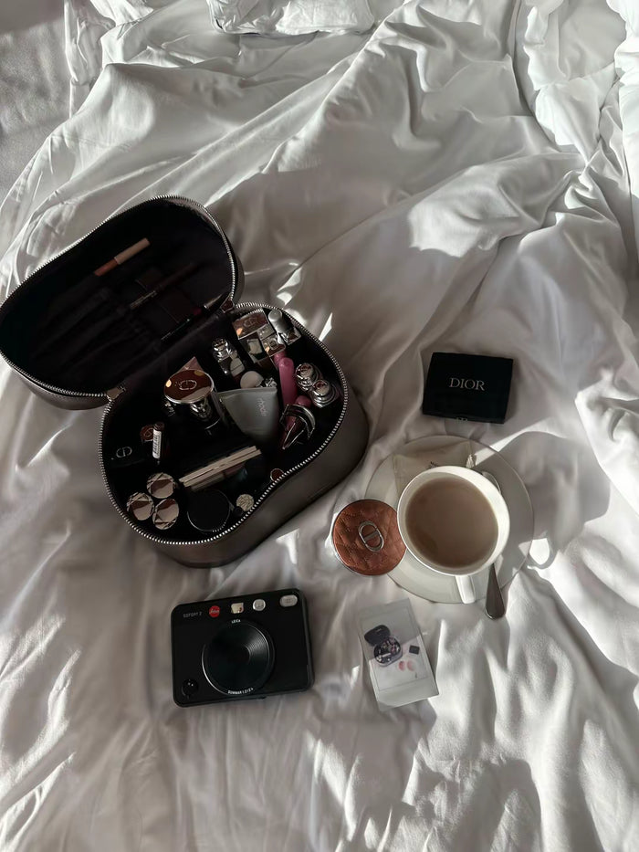 The Vanity Case is water-repellent and resistant to everyday spills. It can be easily cleaned with a soft, damp cloth to maintain its elegant look.
